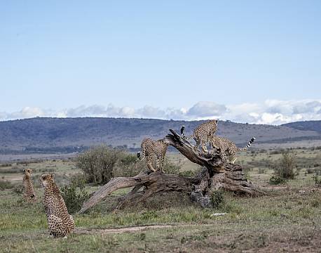 På disse familieture var vi så heldige at løbe ind i savannens 5 gepard brødre, hvor tre af disse valgte at lave opvisning på træstubbene.