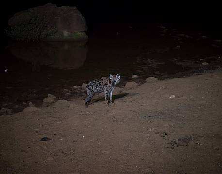 Alt imens en dejlig kop kaffe blev nydt, så kunne vi følge hyænerne luske rundt lige ude foran trætop-hotellet.
