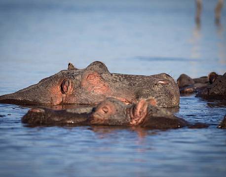 Flodhestene bader de første varme solstråler en tidlig morgen.