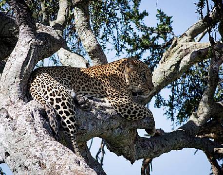 Leoparden ligger, i toppen af et træ, og venter på nattens jagt.