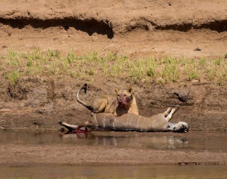 En hunløve nedlægger en kudu (antilope) foran øjnene på et par safarigæster.