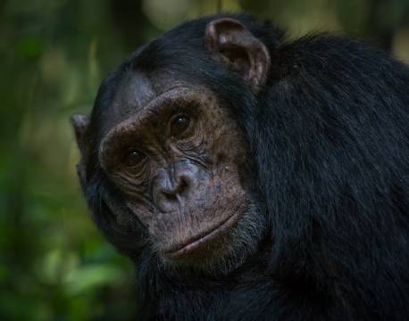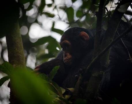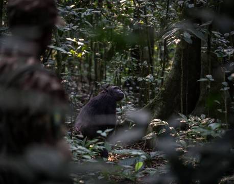 Gennem skoven i raskt tempo. Ud af det blå kommer en chimpanse ned fra et træ. Vi følger ham et stykke. Pludselig sætter han sig. Han lader os observere ham. Vi kigger på ham - han kigger på os.
