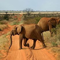 I Tsavo East nationalparken fås et imponerende indtryk af de næsten uendelige vidder med natur, som Kenya kan fremvise, og som vi skal bo midt på. Den rustrøde jord er kendetegnende for dette område, hvilket er årsagen til de mange og store elefanter - som nationalparken er kendt for – ofte synes røde.