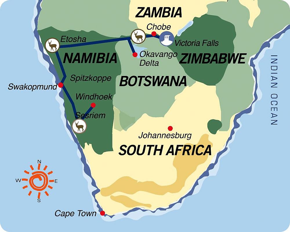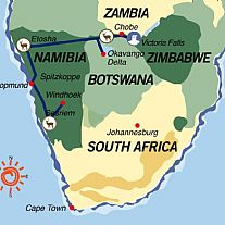 En storslået rundrejse i det sydlige Afrika, hvor der blandt andet er inkluderet unikke oplevelser i ørkenlandet Namibia med de 400 meter høje sanddyner og Etosha National park foruden besøg i Okavango deltaet og Chobe i Botswana, hvor man finder én af verdens største koncentrationer af elefanter. Til slut opleves det tordnende Victoria Falls på grænsen mellem Zambia og Zimbabwe – en stor og brusende oplevelse og et fantastisk minde for livet.