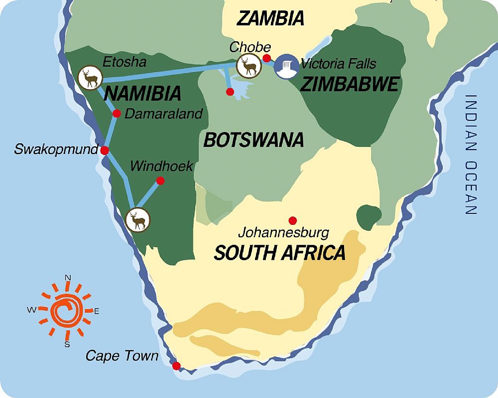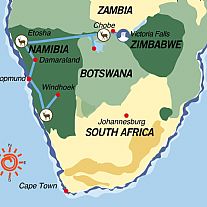 Denne rejse er kontrasternes rejse med store naturoplevelser. Nogle afgange starter modsat med start i Victoria Falls og slutter i Namibias hovedstad Windhoek.