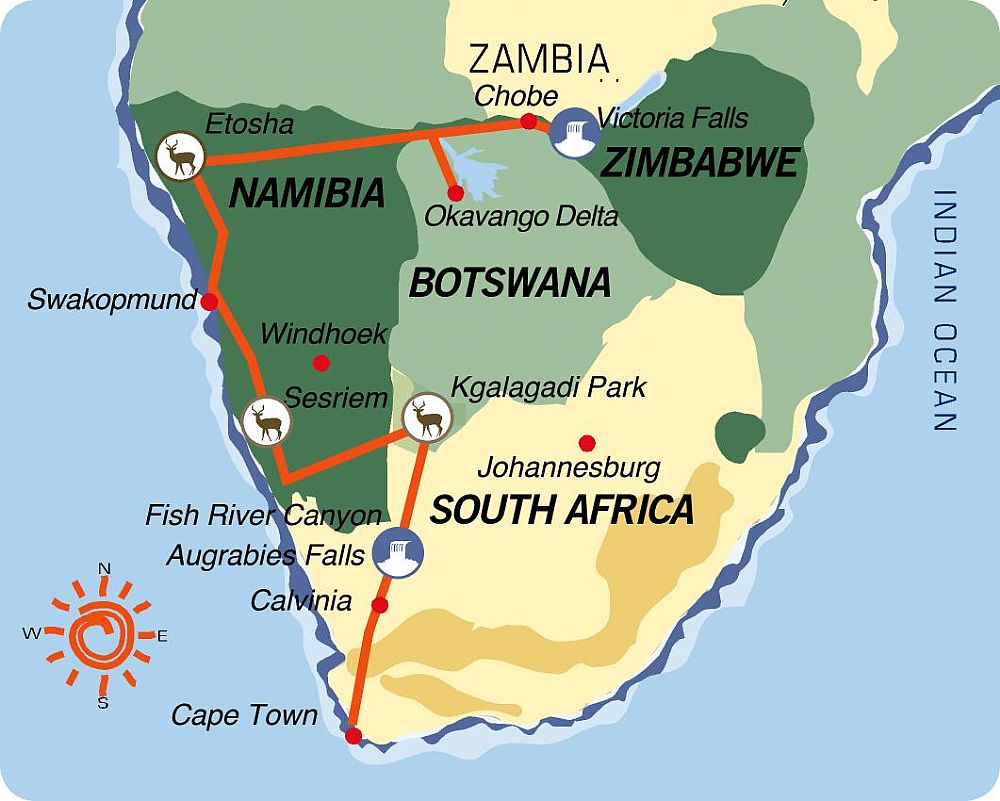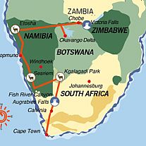 Velkommen til denne fantastiske rejse med engelsktalende guide fra Cape Town til Victoria Falls eller modsat fra Victoria Falls til Cape Town. Undervejs besøges mange af de bedste steder i det sydlige Afrika. I begiver jer ud på en spændende rejse, hvor I kommer igennem lande som Namibia, og Botswana. Undervejs vil I opleve forskellige befolkninger og kulturer, og selvfølgelig en helt fantastisk natur.