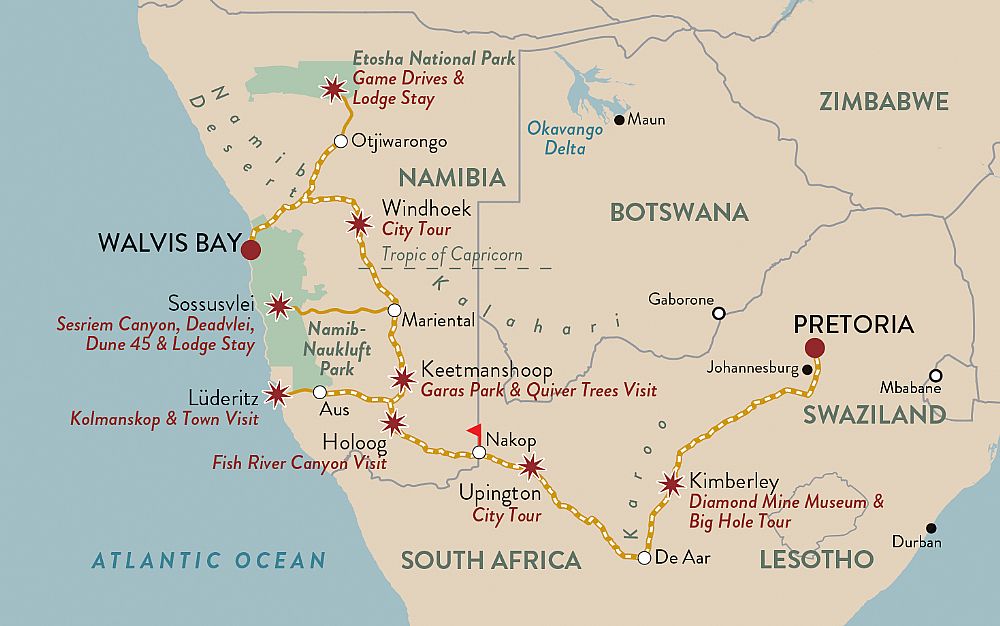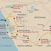 På dette togeventyr fra Pretoria i Sydafrika til Walvis Bay i ørkenlandet Namibia opleves seværdigheder som ”Big Hole”, hvor Sydafrikas diamanteventyr startede. I bevæger jer gennem den sydligste del af Kalahariørkenen til den imponerende Fish River Canyon og videre til Atlanterhavskysten.