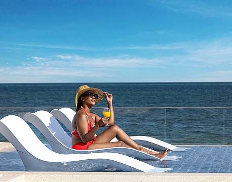 For enden af poolen og med udsigt til stranden ligger Maji Beach Bar, som byder på en afslappet og hyggelig stemning. Her kan du nyde kolde forfriskninger, cocktails og lette snacks – enten fra barens karakteristiske gyngesæder, poolen eller en liggestol med udsigt over havet.