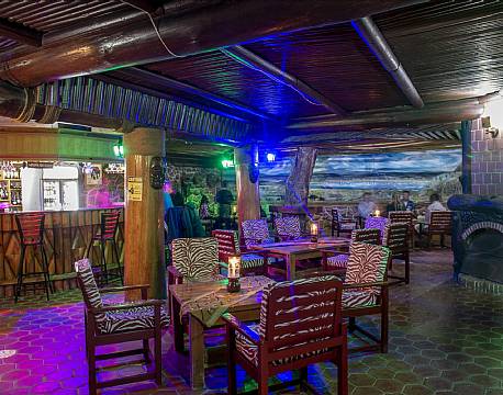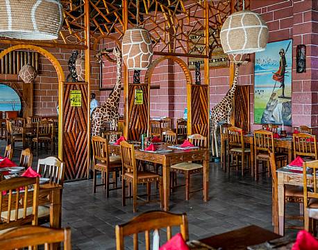 Man spiser godt på Lake Nakuru Lodge, og der er en fin udsigt fra restaurantområdet ned over parken. Udover restaurant og bar er der også en swimmingpool på lodgen.
