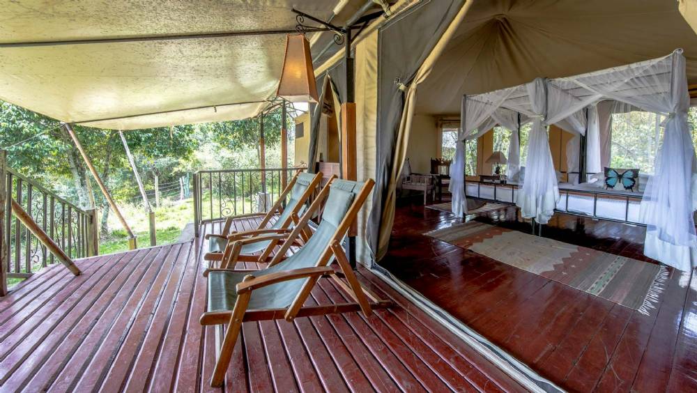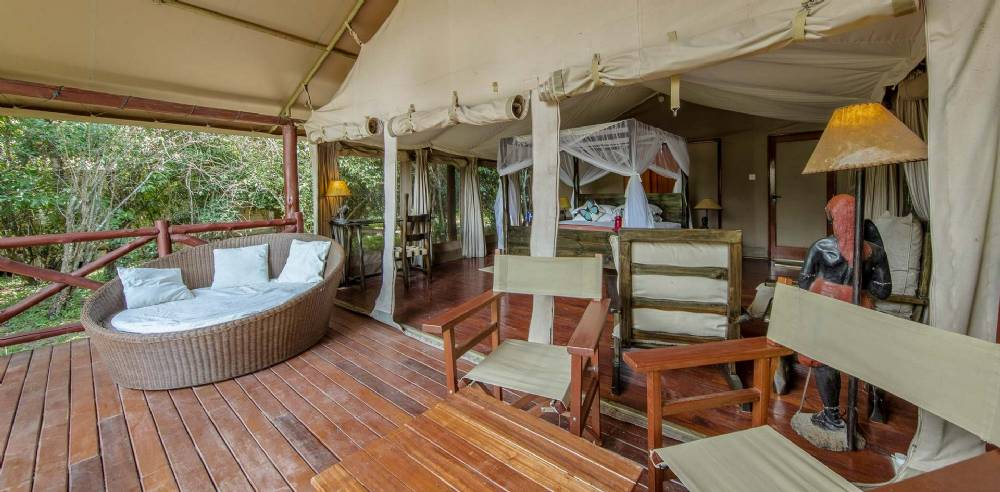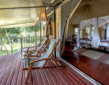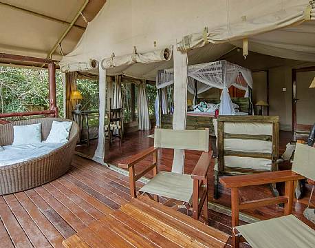 Fra træterrassen foran de store luksuriøse telte er der udsigt til floden eller savannen og her kan man sidde og slappe af, når man ikke er på safarikørsel. Når man træder ind i teltet, rammes man af ægte safari stemning.