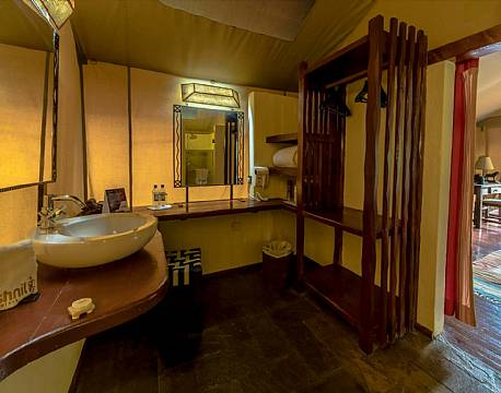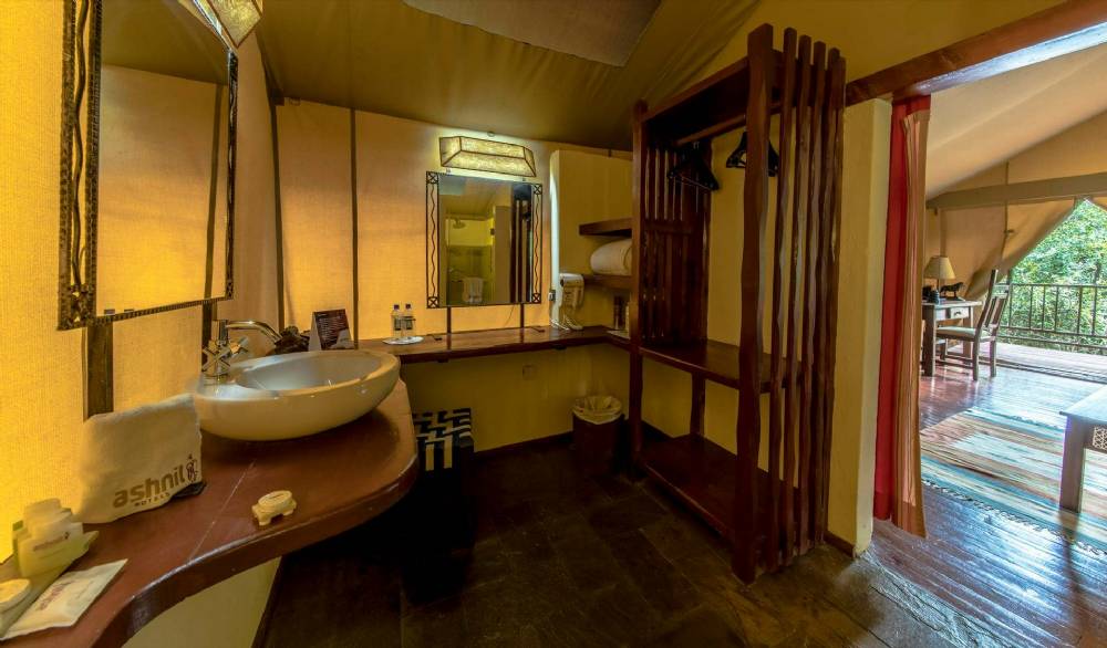 Hvert telt er udstyret med privat bad og toilet, hvor der er en hårtørrer. Sengen er udstyret med myggenet og i teltet er der også et komfortabelt sofaområde med mulighed for afslapning samt safety box og ventilator.