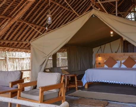 Indkvarteringen består af 20 rummelige safaritelte, smukt placeret blandt tamarindtræerne omkring vandhullet. Teltene er indrettet i klassisk afrikansk stil med varme farver, elegante detaljer og eget badeværelse. Hver bolig har sin egen private veranda, hvorfra du kan nyde udsigten og følge dyrelivets gang – ofte direkte fra første parket. Campen rummer både standardtelte og suiter, hvor suiterne ligger tættest på vandhullet og byder på ekstra plads og komfort.
