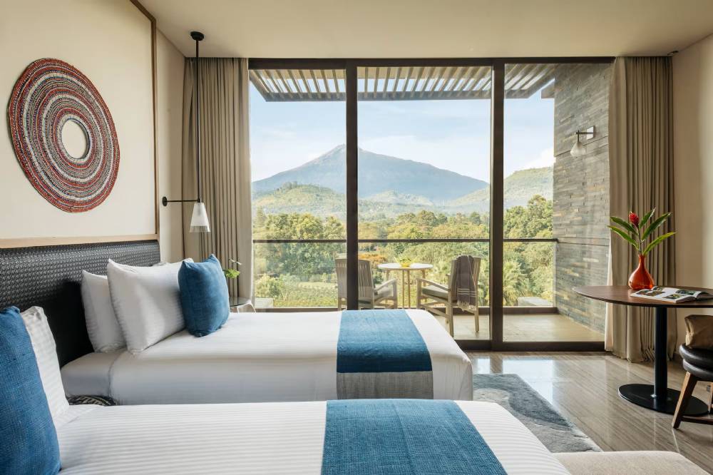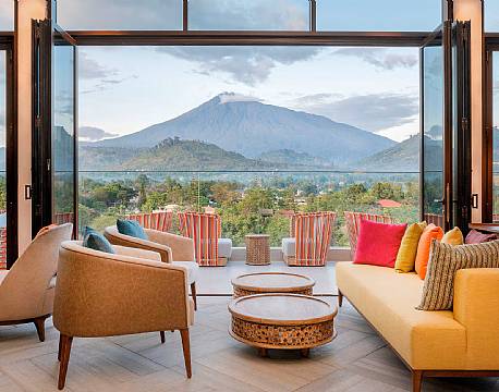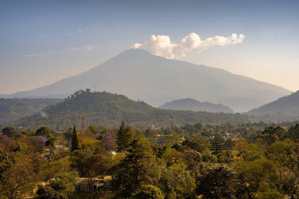 Fra hotellet er der på klare dage en betagende udsigt til det nærliggende bjerg - Mount Meru - der er Afrikas fjerdehøjeste bjerg med sine 4.566 meter.
