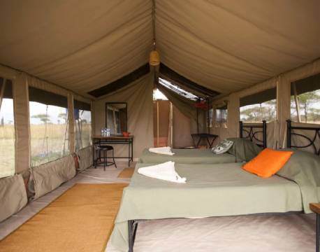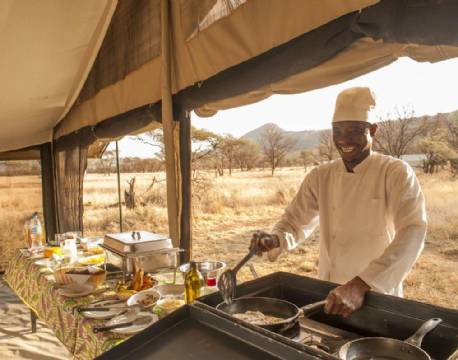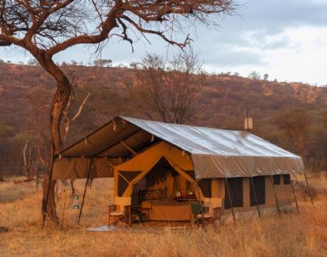 Indkvarteringen er en charmerende blanding af komfort og ren vildmarksstemning. Teltene er rummelige og hyggeligt indrettet med bløde senge, myggenet, privat badefacilitet med bucket shower og toilet samt en lille veranda, hvor du kan nyde stilheden og udsigten til savannen. Her kan du vågne til den røde sol, der stiger over horisonten, og falde i søvn til lyden af hyæner og gnuer, der vandrer forbi i mørket. Det er simpelt, varmt og autentisk – præcis som en rigtig safarioplevelse skal være.
