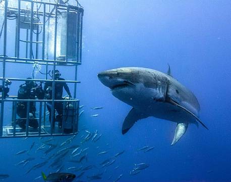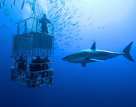 Når hajerne dukker op kan man iføre sig en dykkermaske og ikke mindst en våddragt, så man kan holde varmen i det kolde vand, for derefter at gå ned i et bur, som hænges ud i vandoverfladen på siden af skibet. Fra buret kan denne oceanernes imponerende og strømlinede jæger nydes, og man kan ved selvsyn opleve, at det dybe sorte ”hul”, som dens øjne ofte opfattes at være, faktisk skjuler nogle smukke brune øjne.