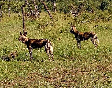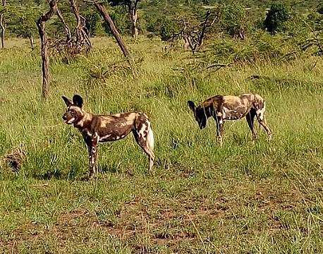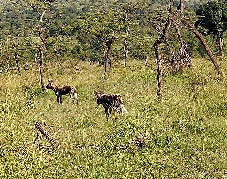 Begejstringen var MEGET stor, da vores guide Daniel fra Karen Blixen Camp spottede disse 2 vildhunde på morgenens safarikørsel.