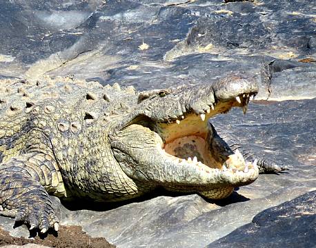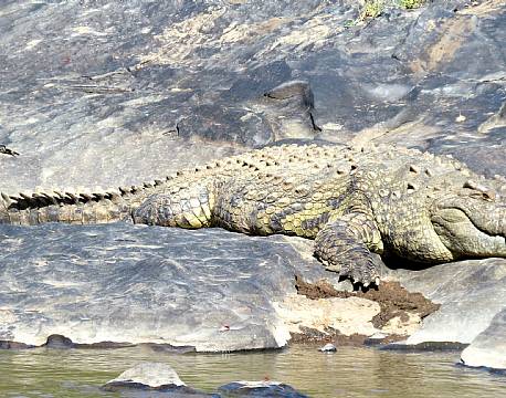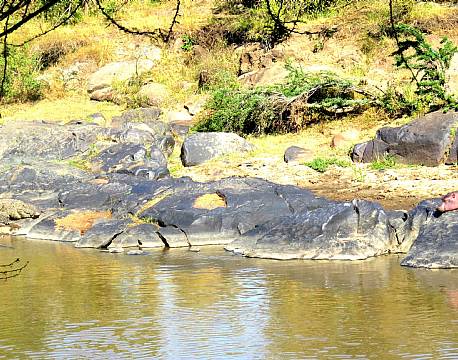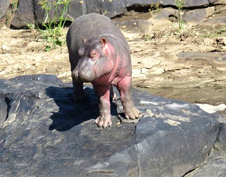 Lige foran telt 7 og 8 var en babyflodhest kravlet på land, da den ikke kunne modstå solens varme - det var dog kun få meter fra en meget stor krokodille. Den øvrige flodhestefamilie blev i vandet.