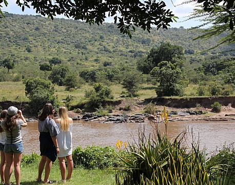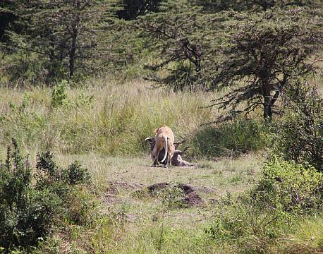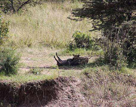 En vidunderlig stille og rolig formiddag. De fleste af gæsterne var ved at være færdige med morgenmaden og nogle lå i liggestolene og nød udsigten til Mara-floden og vortesvinet med sine unger på den anden side af floden, der var ved at drikke, da en hunløve dukker frem af græsset og i løbet af få sekunder får skilt vortesvinene fra hinanden og nedlagt sit bytte - vortesvinmoderen.