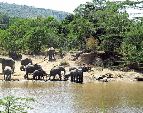 Det er en stor glæde for vore gæster, når dyrene trækker til floden for at drikke og dette skue kan nydes fra hovedbygningen. Vi har nu 3 elefantfamilier, der næsten dagligt kommer for at drikke og det går lystigt til, når elefantungerne indtager scenen.
