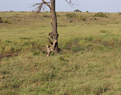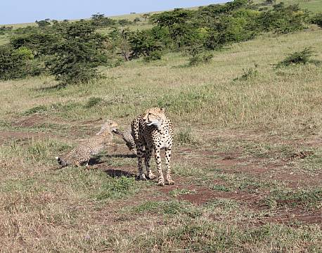 Gæsterne i bilen følte sig godt underholdt, da ungerne løb rundt mellem buske træer og gepardmoderen havde travlt med at holde øje med de 2 små.