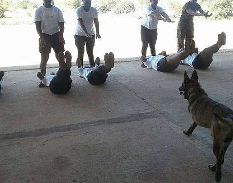 The initial training is focussed on mentally preparing the candidates and giving the trainees an understanding of what the job entails, what we expect and the codeo of conduct for the Black Mambas; as well as developing discipline for the individual and the group as a whole. Apart from the team-building exercises, this stage of training included: the parade and drill procedure, arrest protocol, radio usage and protocol, general information about the job, fence line patrols and the identification of spoor, search and seizures of person and vehicle, physical fitness training, and to build team spirit and moral.