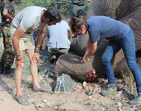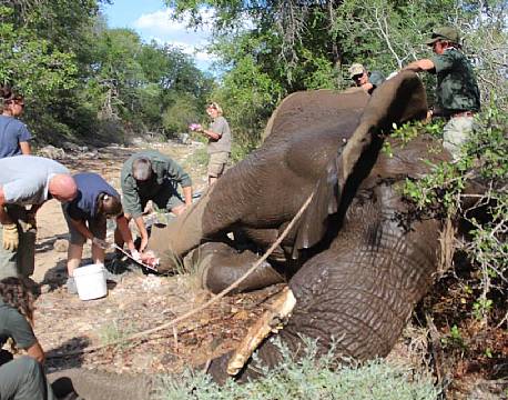 Craig’s Wardens meeting had to be interrupted by a phone call from one of the lodge managers. He reported a young elephant bull that seemed to be wounded as he was unable to stand on his right front leg. Whilst we met up with the lodge guides that spotted the elephant we decided we needed to take action quick. The vet came in to dart him so that we could start the treatment. Once darted the elephant awkwardly fell down a slope of a dry riverbed, which made the treatment more difficult. Luckily we were able to treat him quickly. We noticed that this young bull was the same bull that was hit by the mining train in December. His right front and back legs were very swollen and purification had set into his knee joints. He also unfortunately broke his left tusk, but luckily he was in good body condition otherwise! The wounds got treated and he was given a good painkiller, long term antibiotics and insecticide. We suspected that we had to retreat him again in a couple of weeks. We kept our eye on him to see how he responded to the treatment. He is doing better but we noticed that we needed to retreat him one more time. Therefor he was darted a second time and the wound was treated once more to ensure 100% healing. We hope he will recover quickly and enjoy a pain free life again as a young and happy young elephant!